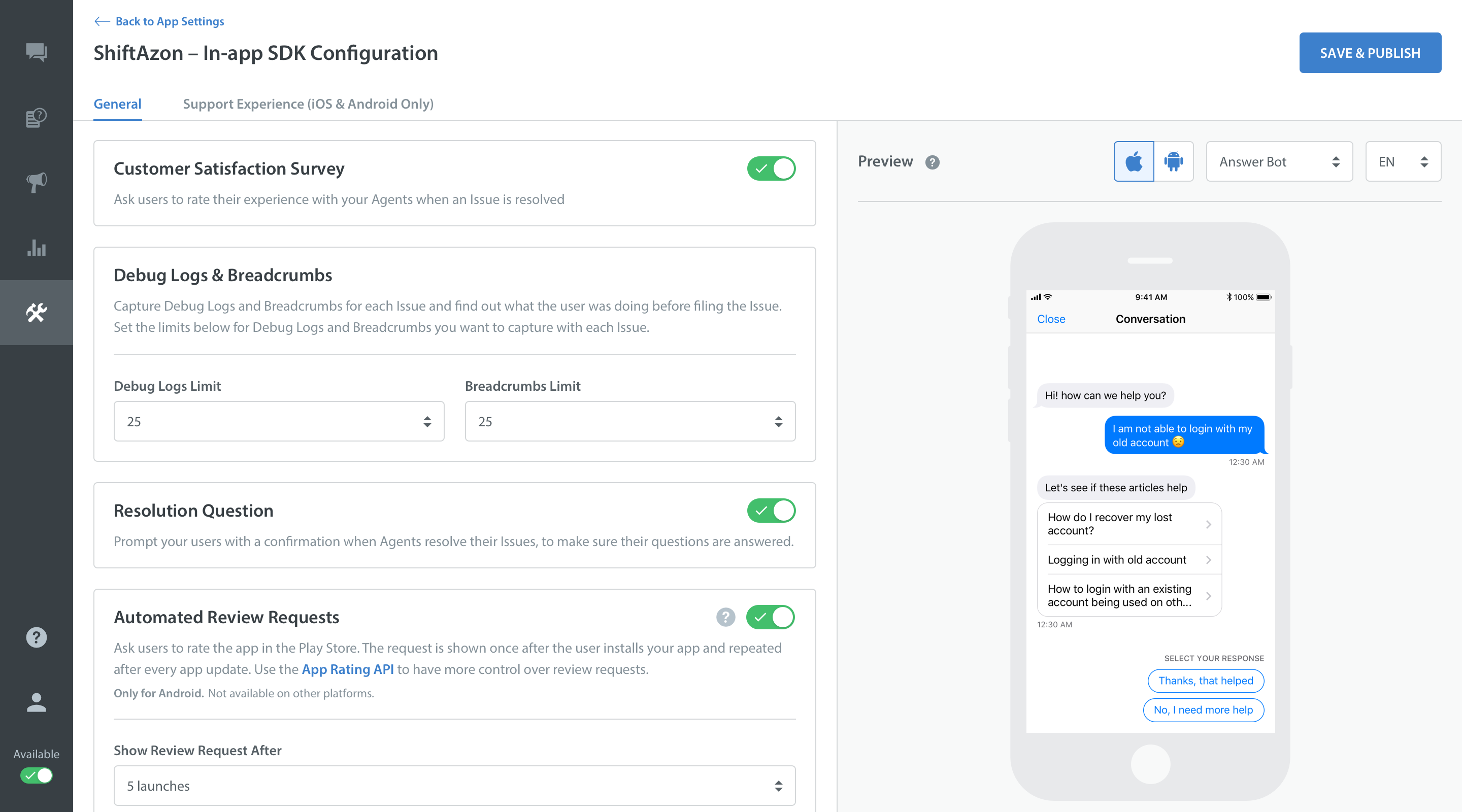 If you want to show the Resolution Question to your users when an issue is resolved, you can turn the feature Resolution Question, ON from the in-app configuration page on the Admin dashboard. Settings > App settings.