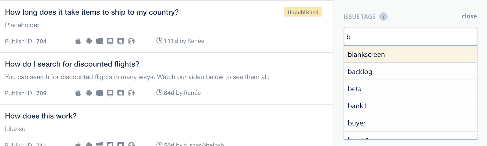 - Issue tags are used to filter the FAQ list in the Helpcenter on Helpshift Widget with the filter rules.